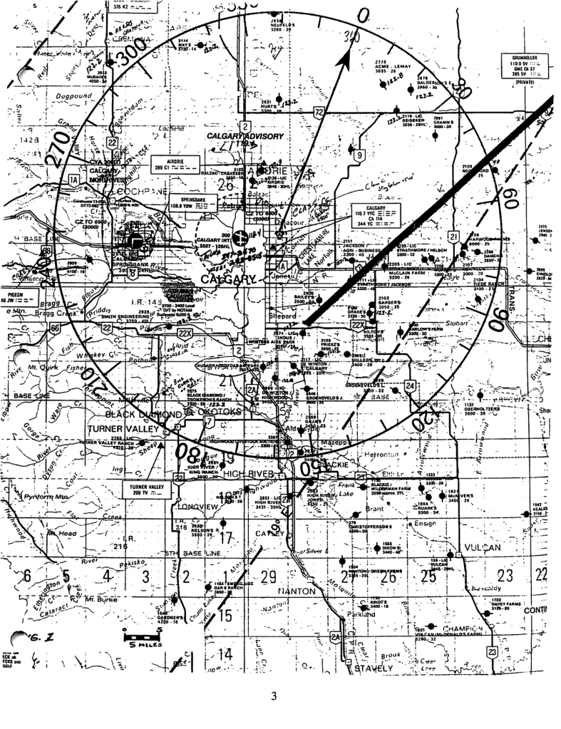 Figure 1 is a map of the Calgary area. Progress has made its mark. Within 30 miles of Calgary are more than 50 airports/aerodromes. Not to mention the unshown strips. All of this within an area of 2,500 square miles. Note the city covers more than 200 square miles and the Calgary control zone is 100 miles. Note also, the restricted area on the Sarcee Reserve, and the “ALERT” or training area north of Cochrane.