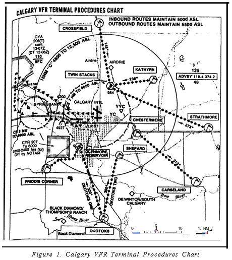 Figure 1 is a map showing the VFR terminal procedures to get into and out of Calgary. I’m not suggesting that you want to get into YYC; I doubt you’d get permission. Besides, I think we should keep a low profile. The reason for Figure 1 is to show the control zones and recommended traffic routes in the area. Knowing where and how the big machines enter/exit the Calgary area is good information. Forewarned is forearmed. Study Figure 1 and take a mental picture. Note the Bow River corridor between Calgary and Springbank. There is a lot of east-west traffic through there. Note the words in the upper right-hand corner. Inbound flights at 5,000 feet ASL and outbound flights at 5,500 feet ASL. A 500-foot separation. If you are considering flying north-south through the narrow space between the Calgary and Springbank control zones at 1,000 to 1,500 feet AGL, I’d recommend keeping a sharp lookout for traffic at the 3 and 9 o’clock positions. A mid-air broadside can ruin your whole day!