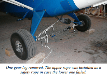 Work started by first removing one of the gear legs from Chrissy to use as a guide. I find that the easiest way to do this is to use a come-along between the axles to release the tension on the shock strut, then remove them one at a time. There must always be one shock strut in place at any given time, or the landing gear will collapse.