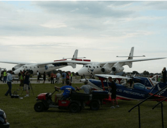 Two aircraft arrived ceremoniously while we were there. The first was Virgin Galactic’s White Knight Two, which is the carrier vehicle for the first commercial space flight venture, designed and built by Burt Ruttan. This aircraft spent about 20 minutes flying around demonstrating its maneuverability and grace. I found this really impressive with its dual fuselage design. It looked like an optical illusion.