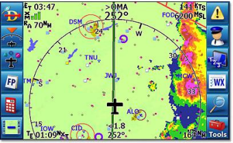 The ATC offers all the navigation and other features you’d expect from a GPS, like flight and route planning, terrain mapping, optional obstacle clearance, basic on-screen flight instrumentation, E6B functions and more. There are a series of menu buttons that occupy the sides of the screen, and you can easily make these disappear or re-appear with a single touch. This maximizes the viewable area and is very handy in use.