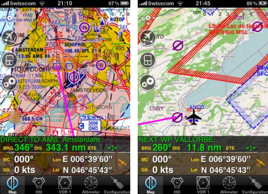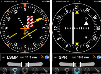 With the upcoming trip to Oshkosh, I’ve decided to see what options are available to use the iPhone as an aviation GPS. A quick search led me to Air Navigation by Xample Sarl. This application comes in three flavours. The first level is the Free version. With this you get a database of over 30,000 airports and waypoints worldwide (and yes, it includes Bishell’s and Kirkby’s fields) and three instrument views, an HSI, a VOR CDI and an ADF needle. There is also a groundspeed indicator in a separate screen. Finally, a ball slip indicator is provided in all screens. There is no moving map in the free version.
