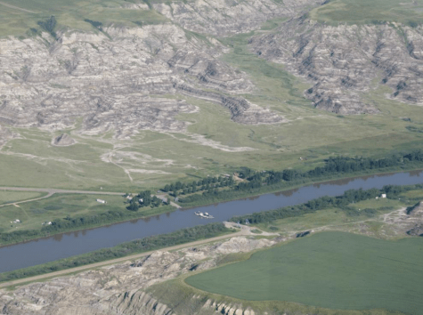Soon the Red Deer River valley came into view which goes on all the way into the haze of the distant horizons, both to the north and to the south-east. An unbelievable panorama that is breathtaking. The wind had now increased in velocity and I was crabbing into the south easterly winds. I crossed the Red Deer River and announced my intentions to the absent air traffic at Drumheller. My goal today was to take some pictures of the fairly unknown river crossing a few miles upstream from Drumheller.