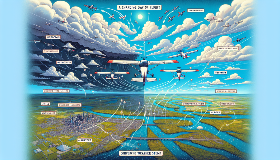 We had the most challenging day of flying today. If any of you were watching the SPOT this should explain it. We first flew direct to Ottawa Carp from Moncton. I had been watching the weather as the flight when along. There was two systems that were converging and there looked like little time to get through. A quick turn around and we were on our way. We tried to pick our through and decided for Pembroke. We dropped below the scattered layer that soon went to broken and ceilings left the building. We turned around. So much for the forecasted 4000 broken. I think they missed a zero;-)