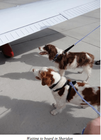 With the date set and all arrangements in place I asked my pilot friend Carl if he would like to come along. He jumped at the chance for a new flying adventure. It’s a four-hour flight plus a stop at Great Falls, MT to clear customs so we decided to head south the afternoon before and stay overnight. This gave me time to take care of that other business in Sheridan. Then at 0900 the next morning we met Heidi, her husband and the two Brittanies, Colby and Ethan, at the Sheridan airport. While they seemed a bit nervous with the airport surroundings and meeting strangers as soon as we started loading, they got right into it. They willingly climbed aboard and settled happily into the back of the aeroplane.