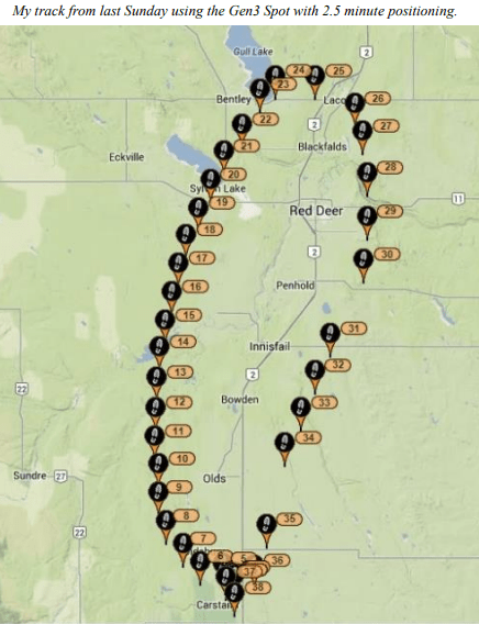 The new Gen3 Tracker allows the owner to select between their basic tracking of 5-minute intervals or to upgrade to the Extreme service with a 2.5-minute interval. This reduces a potential search area to only 20 sq. miles! One issue I’ve had with the old device is that if it cannot contact either the GPS or the GlobalStar satellite, it does not immediately retry. Instead, it waits for another full interval before retrying. At 2.5 minutes, this isn’t as big a concern, but at 10 minutes, this can leave a sizable gap in your track. You can see by the picture of my track that it missed three points: one between Gull Lake and Lacombe and two others on the way back to Carstairs.