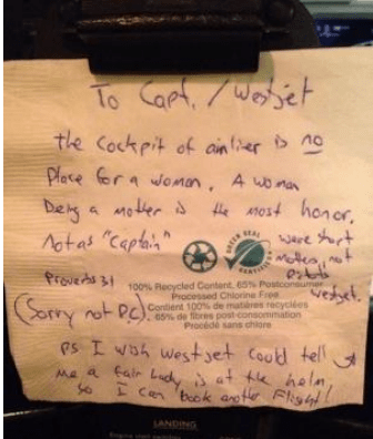 “The cockpit of an airline is no place for a woman. A woman being a mother is the most honor, not as ‘captain.’ Proverbs 31. Sorry not PC”. It goes on to say, “I wish WestJet could tell me a fair lady is at the helm so I can book another flight!”