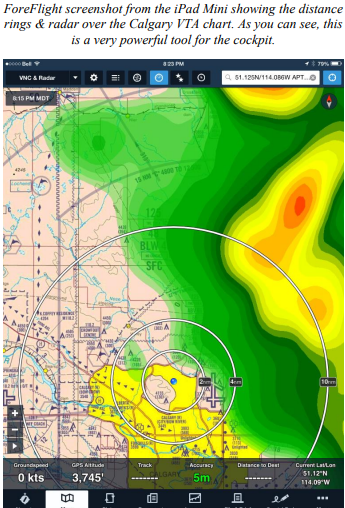 I’ve only done one flight using the iPhone app, but what I saw certainly impressed me. One of the neat features is when you zoom in on a location that is covered by both a VNC and VTA. As you zoom in, the mapping will automatically change from VNC to VTA. Also, a single tap on the map will flip from VNC to VTA. The other feature I found quite useful is the distance rings. You can set them up to display at fixed distances around your location (ie. 5, 10 & 25 nm or 2, 4 and 10 nm) or you can set it up to automatically scale the rings based on the zoom factor. It makes it very easy to estimate your distance from a reference point without making any inputs which is great for relaying position reports.