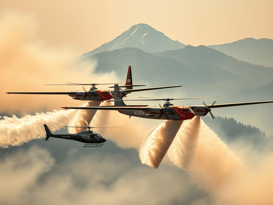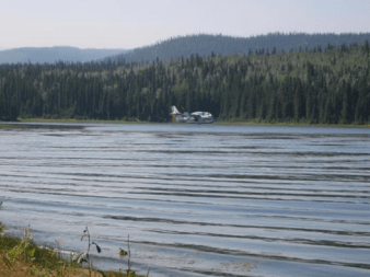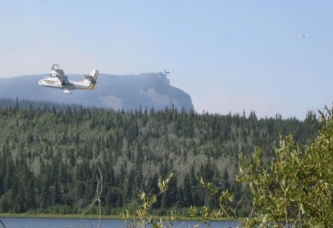 These aircraft were working from Elwin Lake and the feature in the background is called China Nose. The fire was in behind it so we could not see the drop. It was taking the aircraft about 12 seconds to pick up 6000 liters of water which was likely mixed with 24 liters of fire suppressing foam. It took about 10 to 15 minutes round trip from pick up, drop and back again. The wind was almost calm and at one point they turned and were picking up in the opposite direction.