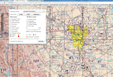The map control window offers some good features. You can overlay weather information like radar and satellite info, and you can turn VTA charts on or off. When US and Canadian maps overlap, you can choose which one you want to view. You can also turn on airspace and TFR boundaries, though this only works for US locations.