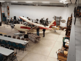 The wind from the northwest was decidedly cooler than in Innisfail so we left Blair doing his thing with the radio and sought refuge in his huge hangar. And what a hanger it was! Any pictures we took do not do it justice. It was large, well-lit and warm! The centerpiece was Blair’s Stinson on skis. Next was tables and chairs for about 80-90 people. The hangar also doubled as the family museum. The rear wall under the Mezzanine was divided into alcoves that depicted different rooms of a turnof-the century house. One alcove was the kitchen complete with antique stove, table and chairs, including a wheeled wooden highchair that folded down into a child’s stroller. Next was a “Parlor” or sitting room with 2 pianos then a period bedroom after that.