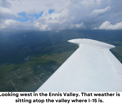 Freshly fueled and happy to be on our way again, we took off and headed south. We flew toward Helena near where we’d angle southeast for Ennis and another fuel stop. Our other option from Helena was to go southwest which would put us in a valley toward Butte and later Dillon along I-15. I went that way in 2019 with Doug Eaglesham and Dennis Fox. But back then we had better weather for it.