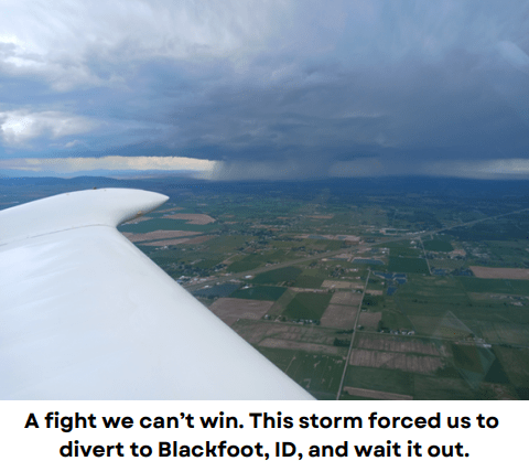 We wound up having to set down at Blackfoot, a town about 20 miles up the road from Pocatello. We cooled our heels and pored over the radar for a bit more than an hour as a big cell battered our destination. Like a school yard bully bored with beating his victim, the storm finally trundled off to the northwest leaving us an unfettered path to our final landing of the day.
