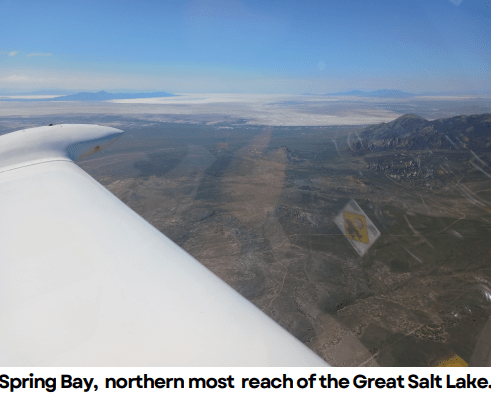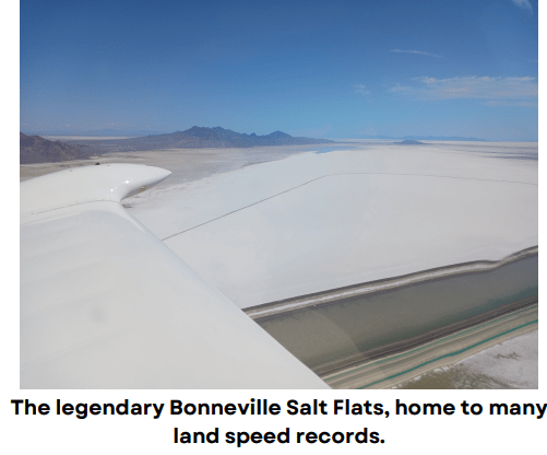 We lit out eastbound, climbing slowly over the bright white salt flats. We flew along a roughly 10 mile wide strip of airspace between the previously mentioned restricted zone to the north and a similar one to the south. We passed just south of the famous Bonneville Salt Flats where a lot of land speed records have been set. That was cool to see, too.