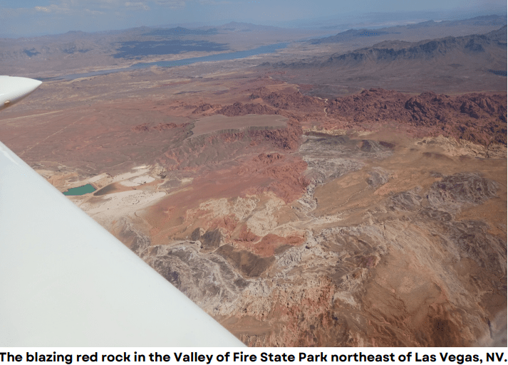 I watched the miles wind down as we left more and more of them behind us. The landscape slowly shifted from one with desert grasses and shrubs to that of almost complete rock and sand. The outcroppings evolved into more rugged and dramatic looking ramparts as we approached the Las Vegas area, especially when we reached the Valley of Fire State Park. There the jagged, iron infused landscape glowed bright red in the falling afternoon sun. The startlingly blue-green waters of Lake Mead, which feeds the Hoover Dam, flowed into sight and we began the set up for our landing at Boulder City.
