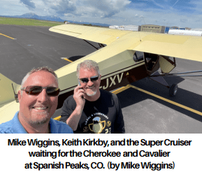 We turned north abeam Las Vegas, New Mexico, and made for a place called Spanish Peaks, just across the state line into Colorado. We’d have a small welcoming party there. Bob’s son Keith lives in Colorado Springs. Keith has longterm use of Bob’s Piper PA-12 Super Cruiser that he hangars at the Meadow Lake airport on the northeast outskirts of the city. Keith and his buddy Mike were en route in the Cruiser to meet us at Spanish Peaks. Then we’d all fly back to Meadow Lake in formation.