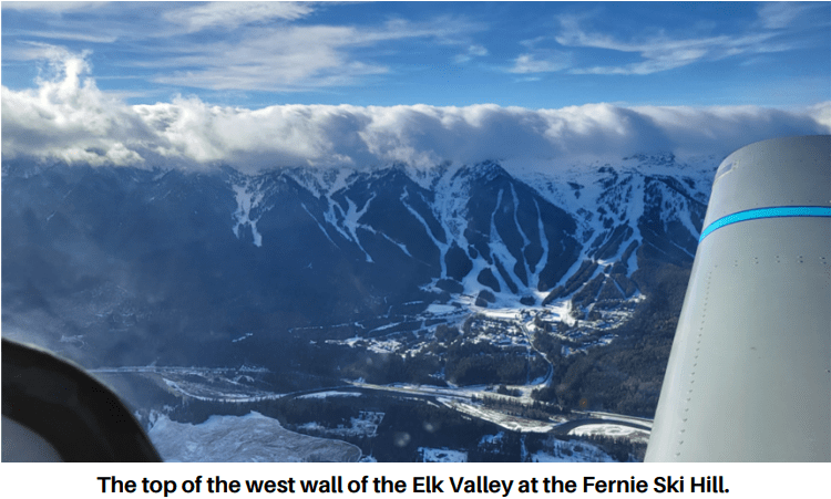 Continuing through the Crowsnest toward Sparwood, I right away realized I was going to have to get back down to get under the clouds. I started down to 8500’. By the time I got to 8500’ I knew I’d need to be at 6500’. I turned the corner into the Elk Valley toward Fernie and saw a shallow but solid wall of cloud sitting atop the mountains that form the west side of the valley. I continued south along the valley, descending further in order to hopefully slip beneath the cloud and make it into the Columbia Valley at Elko.