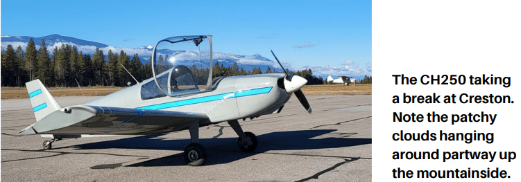 Winter isn’t usually the best time to fly into BC, especially the southern interior region, which gets a LOT of cloud and precipitation in winter. However, we kept our fingers crossed that we’d find a day that would work. And we didn’t need much, either. The flight to Nelson would only take about 2.5 hours at CH250 speeds. The difficulty lay in the ever shortening daylight of November, and the quickly changing mountain winter weather.