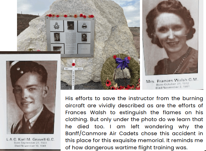 His efforts to save the instructor from the burning aircraft are vividly described as are the efforts of Frances Walsh to extinguish the flames on his clothing. But only under the photo do we learn that he died too. I am left wondering why the Banff/Canmore Air Cadets chose this accident in this place for this exquisite memorial. It reminds me of how dangerous wartime flight training was.