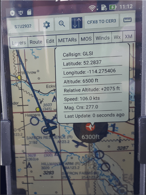 This shot below was taken northwest of Red Deer and shows the information available if I tap on a target icon. I was 20 kts faster and more than 2000’ lower than C-GLSI, and thus able to avoid any conflict. Undoubtedly great information to have.