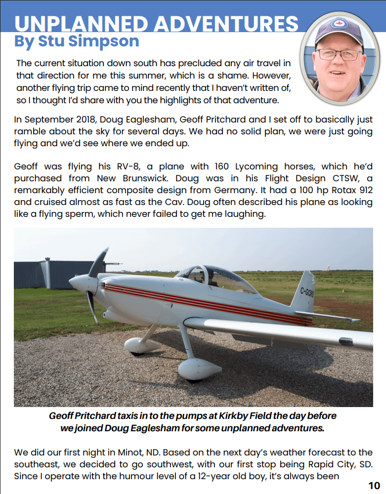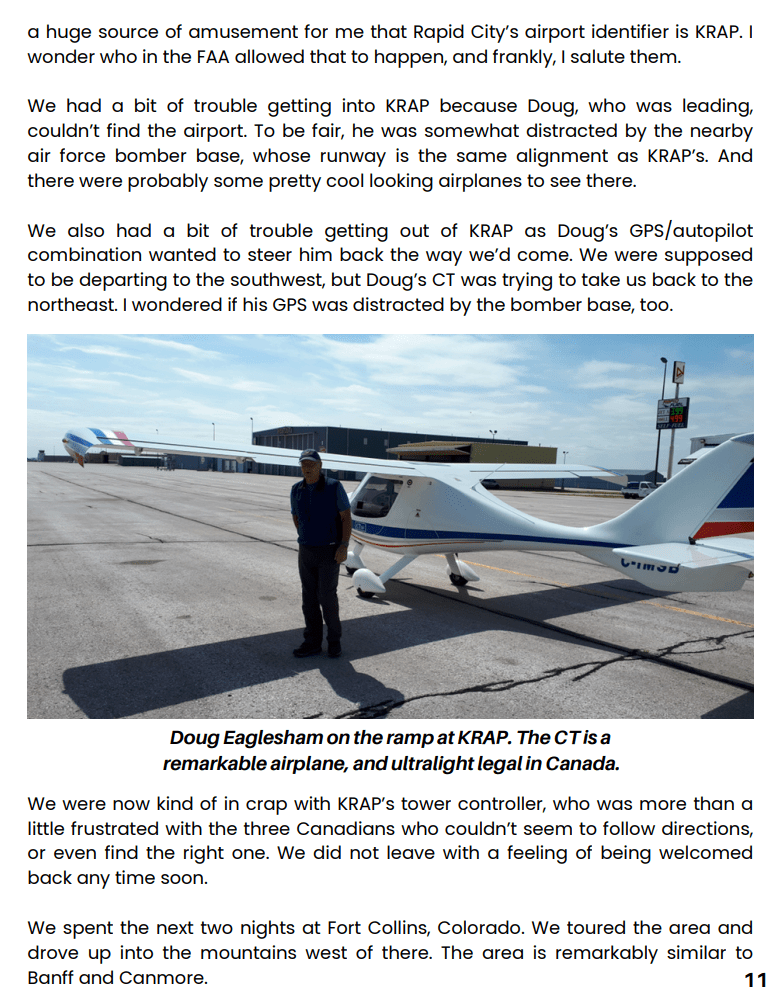 Geoff was flying his RV-8, a plane with 160 Lycoming horses, which he’d purchased from New Brunswick. Doug was in his Flight Design CTSW, a remarkably efficient composite design from Germany. It had a 100 hp Rotax 912 and cruised almost as fast as the Cav. Doug often described his plane as looking like a flying sperm, which never failed to get me laughing.